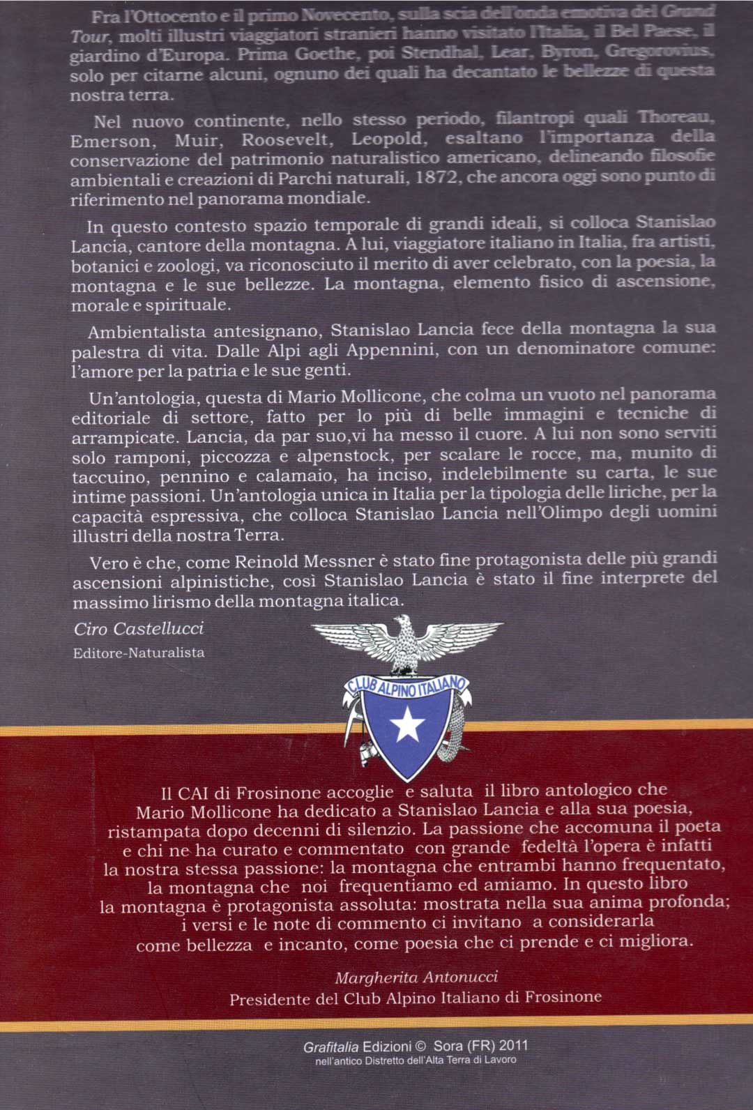 Un’antologia, questa di Mario Mollicone, che colma un vuoto nel panorama editoriale di settore, fatto per lo più di belle immagini e tecniche di arrampicate. Lancia, da par suo, vi ha messo il cuore. A lui non sono serviti solo ramponi, piccozza e alpenstock, per scalare le rocce, ma, munito di taccuino, pennino e calamaio, ha inciso, indelebilmente su carta, le sue intime passioni. Un’antologia unica in Italia per la tipologia delle liriche, per la capacità espressiva, che colloca Stanislao Lancia nell’Olimpo degli uomini illustri della nostra terra.